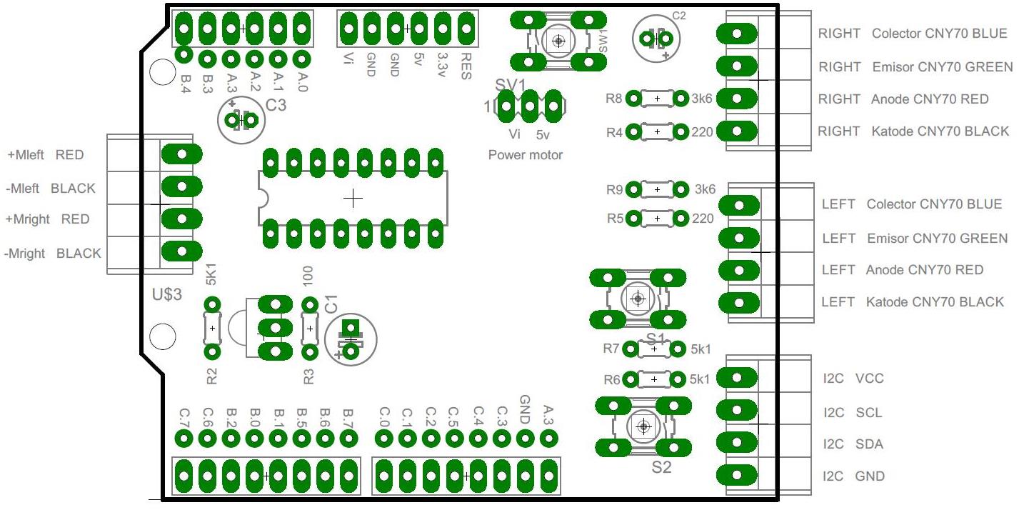 PROPIETATS: Tarja compatible amb Picaxe 28X2 i arduino UNO. 2 polsadors de senyal d'entrada. 1 detector de comandament de infrarojos TSOP4838. 2 sortides per 2 motors(pluggable) controlades per un IC bridge-H SN754410NE alimentable a Vcc o a Vin (jummper vermell). 2 connexions per optodetector CNY70 (pluggable) . 1 Connector per accedir al bus I2C Picaxe. Per arduino cal fer uns ponts. DESCRIPCIÓ: Els ports de connexió als detectors CNY70 tenen 4 terminals: VCC, GND, emissor de fototransistor i ànode del díode. S'utilitza una sortida del microcontrolador per connectar el LED emissor infraroig mitjançant un resistor de 220 Ohms a l'ànode i GND al càtode. En lloc de deixar el LED permanentment connectat, només s'ha d'activar per programa quan es vol llegir els sensors. El col·lector del fototransistor està connectat a VCC i l'emissor està connectat a un entrada analògica o digital tivada a GND mitjançant un resistor de 3k6. Amb el control sobre el LED emissor i la lectura analògica del fototransistor s'aconsegueix fer lectures qualitatives i discriminar la lluminositat ambiental Un dels ports CNY70 es reconfigurable mitjaçant ponts (jummpers) i es convertix en un bus de comunicació I2C (VCC, GND, SCL i SDA). La tarja disposa de 2 sortides bipolars d'1A-5v. per controlar motors, Leds bicolor... ( circuit integrat SN754410NE ). La tarja disposa d'un circuit integrat TSOP4838 que codifica senyals i codis del comandaments a distància, la sortida del TSOP4838 està connectada a una entrada amb facultat de crear interrupcions dins el programa. La tarja disposa de 2 polsadors que com a entrades donen ordres al microcontrolador, una d'elles (BAIXAR) pot generar interrupcions en el programa. Aquesta tarja es va començar a desenvolupar a l'abril de 2015. La tarja dissenyada ha tingut 2 versions. Versió 1.0 prototip inicial. Va ser creada per fer un seguidor de línia (març 2015). Versió 2.0 Es va afegir 2 pins que permeten el control PWM dels motors de forma independent. Tot el demés, té les mateixes funcions que la 1.0 però amb diferents ubicacions dels terminals (abril 2015). El disseny té un error, el terminal + de condensador C3 s'ha de soldar per la TOP. La versió del programari és diferent per la tarja 1.0 i 2.0. Només canvia el mapejat dels port-pins.